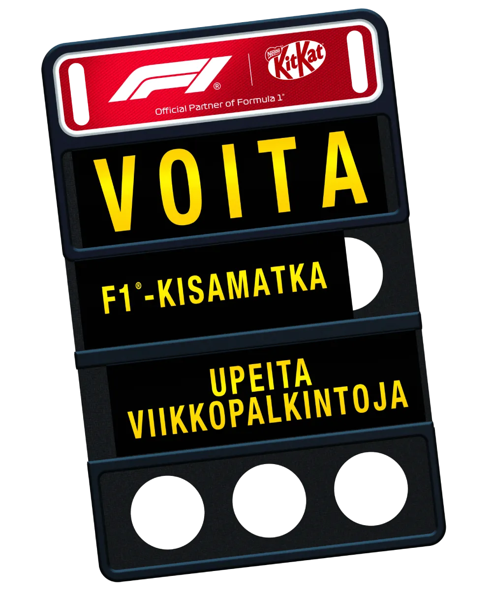 F1-tuotteet ja KitKat-suklaa: Voita eksklusiivisia ja kivoja tuotteita, jotka luovat mahtavaa F1-tunnelmaa. Katso alla, mitä palkintoja voit voittaa. Palkinto sisältää myös valikoiman herkullisia KitKat-suklaita.